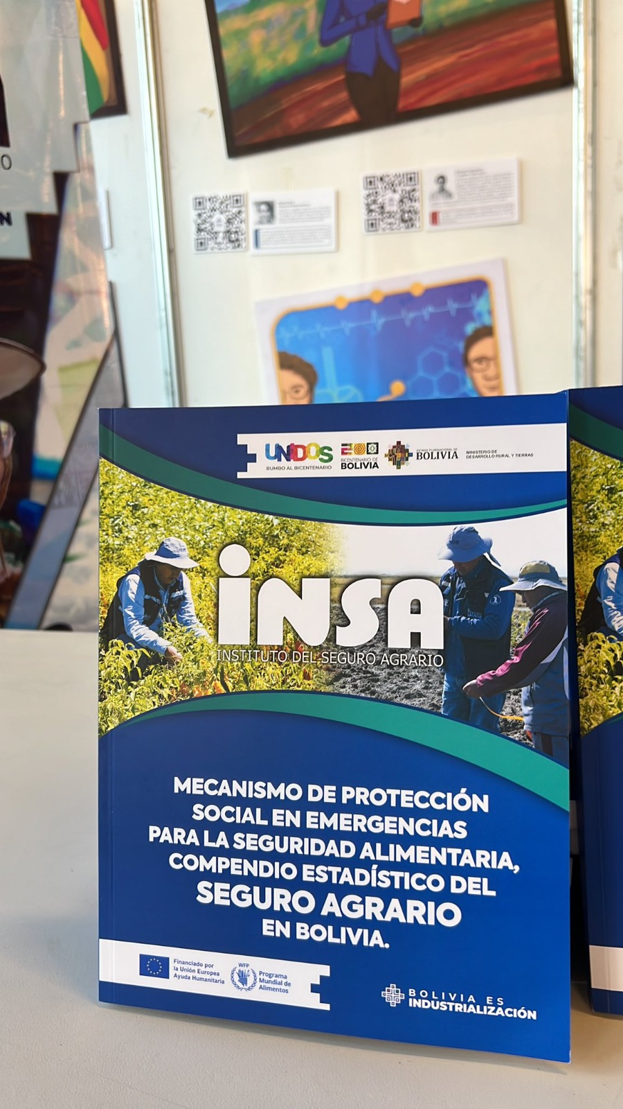 La Paz, 5 de agosto de 2025 – Hoy, en el Campo Ferial Chuquiago Marka, durante la Feria Internacional del Libro de La Paz, el Ministerio de Desarrollo Rural y Tierras a través del Instituto del Seguro Agrario (INSA) presentó el compendio “Mecanismo de Protección Social en Emergencias para la Seguridad Alimentaria: Compendio Estadístico del Seguro Agrario en Bolivia”, en alianza con el Programa Mundial de Alimentos (PMA).